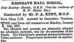 As owner of the Kesgrave Estate Robert became active in community life and he built and supported the Kesgrave District School from 1840 which was considered to be a very generous contribution at this time. He was also the local magistrate and between 1832 and 1836 was the Member of Parliament for East Suffolk. The couple had no children and when Robert died in 1855 and his wife Frances Ann in 1856, the estate was left to her favourite nephew, opera singer Henry Whitworth Jones 1817-1891 who sold the property to Colonel George Tomline of Orwell Park who was a very wealthy landowner and MP.[5] Tomline did not buy the Kesgrave Estate as a residence instead he wanted the land for agricultural use. He therefore let Kesgrave Hall to Francis Aldous Kent who was a schoolmaster. Kent established the Kesgrave Hall School which operated from about 1870 to 1900. An advertisement for the school which appeared in a newspaper of 1871 is shown.