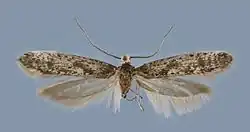 The length of the forewings is 7-8.5 mm for males and 5.9–6.3 mm for females. The forewings of the males are blackish to dark grey-brown, intensely mottled with whitish scales, particularly from the basal fifth to four-fifths. The veins have distinct black dots, particularly along the costa, subcosta, cubital and anal veins, while the medial and radial veins have indistinct brown lines. There is an oblique blackish fascia at about one-third to halfway. The termen is dark grey-brown. The hindwings are dark grey. The ground colour of the forewings of the females is whitish, mottled with a few black scales, particularly along the veins. There are patches of black scales near the base and at the distal end of the cell and there is an oblique blackish fascia at about one-third to halfway, separated into two dashes. The termen is whitish with some blackish dots in the apical part. The hindwings are grey. Adults have been recorded on wing in late July.