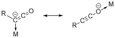 As shown in Figure 5, ketenyl anion has two major resonance structures: ketenyl form and ynolate form. Due to the resonance structures, alkali metal cations can be coordinated to either at central carbon atom or terminal oxygen atom depending on its electronic structure.[5][6] A series of structural analysis revealed both ketene and ynolate structures evenly contribute to the overall electronic structure of ketenyl anion.