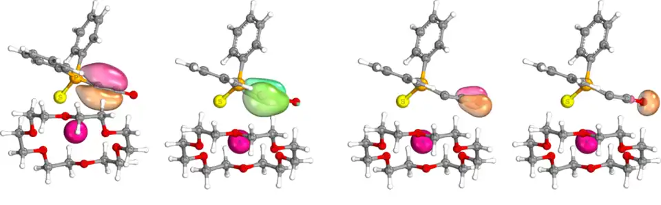 This ketenyl anion can dimerize in solid state as oxygen atoms interacts with alkali metal cation. This dimer can be broken up by adding M(18-crown-6) (where M = alkali metal cation), resulting in isolation of single ketenyl anion structure.[5][9] Intrinsic bond orbitals (IBO) of the molecule [K(PPh2(=S)CCO] reveal molecular orbital describing π-orbital of C-C and C-O and delocalized orbital on oxygen atom.