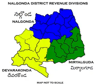 The district is divided into three revenue divisions: Nalgonda, Miryalaguda, and Devarakonda. These are sub-divided into 31 mandals and has 565 villages.[16] Ila Tripati is the present collector of the district.[17]