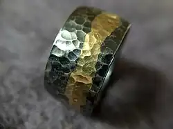 Silver ring gilded with 0,4 mm gold with the keum-boo technique, hammered and blackened