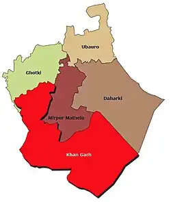 Khan Garh Tehsil is an administrative subdivision (tehsil) of Ghotki District in the Sindh province of Pakistan. It is administratively subdivided into six Union Councils, one of which form the capital, Khangarh.[1][2]