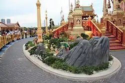 Its history dates back to the ancient Ayutthaya Kingdom, as evidenced by archaeological findings at King Narai's Palace in Lopburi, Thailand.[2] Historically, Khao mor has been a popular decorative feature in royal palaces, mansions of notable individuals, important temples, and royal gardens.[3] However, during the reign of King Rama III, the concept of Khao mor was extended beyond the palace walls and made accessible to the general public, resulting in its increased popularity and making it a significant aspect of Thai temples, architectural style, and culture.[4][5] The term 'Mor', a clipping of Old Khmer 'thma', means rock, and 'Khao' is the Thai word for mountain or hill.[6][7] Khao mor was influenced by the cultural beliefs and practices of India and China that were brought to Thailand, particularly the notion that tall mountains and deep forests were considered sacred lands where angels and gods reside.[4]