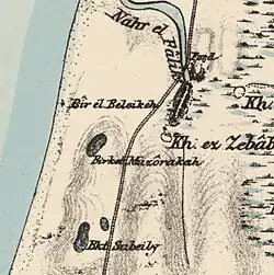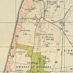 In the 1860s, the Ottoman authorities granted the village of Kafr Zibad an agricultural plot of land called Ghabat Kafr Zibad in the former confines of the Forest of Arsur (Ar. Al-Ghaba) in the coastal plain, west of the village.[5][6] This formed the foundation for Khirbat Zababida, In 1870, Victor Guérin noted it as an old, rather ruined hamlet, named Kharbet el-Belakieh. It was located on a small hill, and had a path leading to a harbour, where water melons were being shipped out.[7]