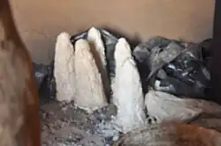 There were other materials that were found when excavating at Kibiro.[25] Some of the other items that were found were iron, pieces of smoking pipes, as well as beads. The beads that were found were common to find while the excavations were being done.[25] The beads were generally disc beads of freshwater shell, and then later in the deposits there were ivory beads and a glass beads as well, which are rare to find, were also found.[25]