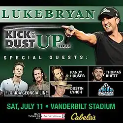 Kick the Dust Up Tour was the third headlining concert tour by American country music singer Luke Bryan, in support of his albums Spring Break...Checkin' Out (2014), and Kill the Lights (2015). It began on May 8, 2015, in Grand Forks, North Dakota and finished on October 30, 2015, in Detroit, Michigan. This tour began the day after his previous tour ended. The tour was the eighth ranked North American tour of 2015, and grossed $71.5 million in revenue.[1]