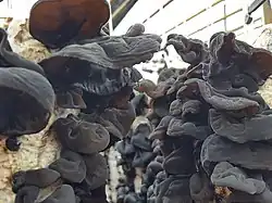 In China, the use of an Auricularia species, probably A. heimuer, as a food and a medicine was recorded in the 3rd-century Chinese medicinal book Shennong Ben Cao Jing.[2] Species were being cultivated in China as early as the Tang dynasty (618–907). Li Shizhen, in his Pen Tsao Kang Mu, quotes Tang Ying-chuan from that period as saying "put the steamed bran on logs, cover with straw, Wood Ear will grow".[6] The fungus is widely used as an ingredient in savoury dishes and is also cooked and served as a salad with vegetables and flavourings. A soup containing the species is used medicinally for dealing with colds and fevers in the belief that it reduces the heat of the body.[7][8] According to a 2010 publication, the annual production of Auricularia species worldwide is the fourth highest among all industrially cultivated culinary and medicinal mushrooms.[9] The estimated annual output in China in 2013 was 4.75 billion kg in fresh weight, with a value of about four billion US dollars.[2]