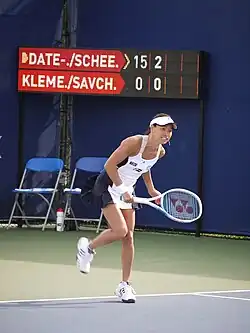 She returned to tennis nearly 12 years later, announcing an unexpected comeback in April 2008. She then won her eighth WTA title at the 2009 Korea Open, becoming the second-oldest player in the Open era, after Billie Jean King, to win a singles title on the WTA Tour.[2] In 2013, she won three WTA Tour titles in doubles and at the 2014 US Open, aged 43, she reached the semifinals of a Grand Slam doubles tournament for the first time in her career. Date announced her final retirement in September 2017.