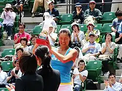 At Wimbledon, Date defeated British wildcard Katie O'Brien, 6–0, 7–5.[13] This win also marked her first main-draw victory at Wimbledon in fifteen years. In the second round, after winning the opening set, she lost a close-fought match on Centre Court to former world No. 1 and 23rd seed, Venus Williams, 7–6, 3–6, 6–8 in a match lasting 2 hours, 56 minutes.[14] With her partner Zhang Shuai, She advanced to the third round of the women's doubles at Wimbledon for the first time in her career.
