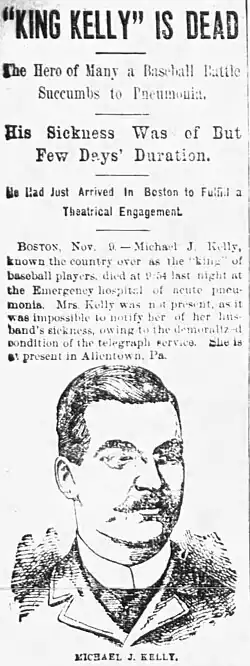In November 1894, Kelly died of pneumonia in Boston. He had taken a boat there from New York to appear at the Palace Theatre with the London Gaiety Girls. At the start of the final week of his life, an advertisement in Boston read: "Slide, Kelly, Slide. Palace Theatre. The London Gaiety Girls, Chaperoned by King Kelly, the Famous $10,000 Base Ballist."[27] During the week, his name was deleted when he was too ill to appear. "He caught a slight cold on the boat from New York, but thought little of it", a writer said upon his death.[28]