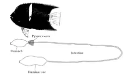 The digestive tract in angelfishes is fairly simple and is composed of a pyloric caeca attached to the stomach and an intestine connected to the terminal sac.[17] They have an expanded region of the intestine called the hindgut chamber, where a diverse microbiome is used to help them digest algae. The hindgut chamber is highly vascularized, which also can help increase the absorptive efficiency of the organ.[18] The king angelfish also hosts gut protists in its rectum, Protoopalina pomacantha, an opalinid flagellate resides in the large hindgut chamber of the fish.[19]