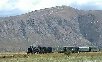 The Kingston Flyer is a vintage steam train in the South Island of New Zealand at the southern end of Lake Wakatipu. It used 14 kilometres (8.7 mi) of preserved track that once formed a part of the Kingston Branch. Originally, Kingston Flyer was a passenger express train between Kingston, Gore, Invercargill, and less frequently, Dunedin. It was operated by the New Zealand Railways (NZR) from the 1890s to 1957. In 1971, NZR revitalised the service as a tourist venture, later leasing the locomotives and rolling stock in 1982 to a private company.[1] Since then, the Kingston Flyer has been through a number of owners, most recently being owned by the Kingston Flyer Ltd. A group of volunteers has restored the railway, rolling stock and locomotives to service.[2] In July 2021 the Kingston Flyer received resource consent to operate, initially for tour groups.[3]