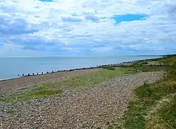 The original village centre including the parish church was lost to the sea around 1630[3] and remains have been found well below the present highwater line.[4]
