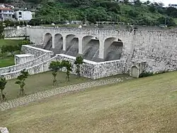 The Kinjo Dam (金城ダム, Kinjō Damu) is a concrete gravity dam on the Li River in Naha, Okinawa Prefecture, Japan. It is designated as a cultural property and is located 500 m (1,640 ft) south of Shuri Castle.[2] Construction on the dam began in 1989 and it was completed in 2000.[3] Its main purpose is flood control and on average, it can control an intake of 40 m3/s (1,413 cu ft/s); releasing 23 m3/s (812 cu ft/s). The 19 m (62 ft) tall and 120 m (394 ft) long dam was constructed on fragile rock and is set on a deep concrete staircase foundation.[1]