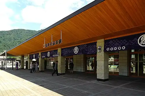 Kinugawa–Onsen Station is served by the Tobu Kinugawa Line, with direct services to and from Asakusa and Shinjuku in Tokyo, and is 12.4 km from the starting point of the line at Shimo-Imaichi.[1]