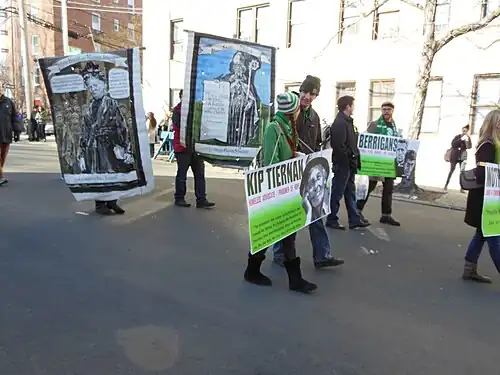 On August 8, 1968, Tiernan organized a press conference at St. Philip's Parish in Boston's South End, to commemorate the building's closing. At the event, she connected with anti-war and civil rights activists, including Daniel Berrigan, Marcos Munos, and members of the Black Panther Party and the United Farm Workers. These relationships inspired her to commit her time fully to civil rights causes.[13][15][16][17]