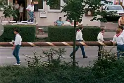 Kirchweih is literally the dedication of a church in German. More generally it also names the celebration of the anniversary of a dedication both at church and in local customs. The festivity is often on the day celebrating a church's patron saint or the day of laying the foundation stone, now often celebrated the following weekend. Customs vary locally in German-speaking countries, also local names such as Kirtag, Kärwa, Kirmes and Kilbi.[1] In Bavaria, all Kirchweih celebrations have been fixed by royal order from the mid-19th century to the third Sunday in October (originally in order to roll back extensive local Kirchweih tourism having gotten out of hand in the government's eyes).