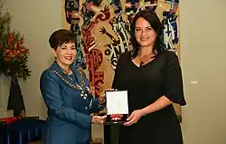 Nathan (right), after her investiture as a Member of the New Zealand Order of Merit by the governor-general, Dame Patsy Reddy, at Government House, Auckland, on 24 September 2020