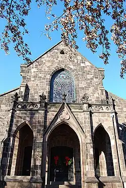 In his design for the chapel, Hardenbergh attempted a "restrained approach to Gothic architecture" that refrained from the excesses ("fripperies") of typical examples of Victorian Gothic.[19] The facade has a porch with three archways and buttresses described in the Architectural Record of 1918 as being suggestive of German Gothic.[27]: p.91 It has lancet windows and an appearance described in the application for inclusion on the National Register as "similar to an English country church".[29]
