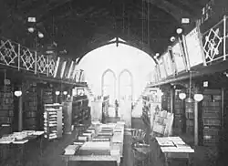 According to Demarest, after the building was completed, college president William Henry Campbell was charged with raising $3,000 to acquire reference books for the library.[38]: p.5 An 1876 survey by the U.S. Bureau of Education reported that Rutgers held 6,814 volumes in its college library and 3,800 in libraries of its two student literary societies—the Peithessophian Society and Philoclean Society.[38][39]: p.2 [40] In 1884, President Merrill Gates appointed a recent alumnus then serving as the college's registrar, treasurer, and faculty secretary—Irving S. Upson (A.B. 1881)—to take on additional responsibilities as librarian. Upson agreed "to devote at least one hour a day to library work, for which he received a stipend of $15 a month, out of which he paid an assistant $2.50 per week. At this time, the library was open daily from 8:00 to 8:40 A.M., noon to 12:30 P.M., and 2:00 to 4:30 P.M."[39]: p.3 [41] Upson increased the holdings by 21,000 volumes before informing the president and trustees in 1894 that the library was inadequate to house the collection.[39]: p.3 [42] The trustees feared that the collection posed a fire hazard or would collapse the floor of the second-floor library.[39]: p.4 [43]