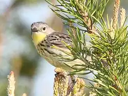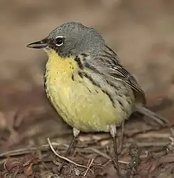 Kirtland's warbler (Setophaga kirtlandii), also known in Michigan by the common name jack pine bird,[3][4] or the jack pine warbler, is a small songbird of the New World warbler family (Parulidae). Nearly extinct just years ago, populations have recovered due to the conservation efforts of the Kirtland's Warbler Conservation Team and its members. The birds require large areas, greater than 160 acres (65 hectares), of dense young jack pine for breeding habitat. This habitat was historically created by wildfire, but today is created through the harvest of mature jack pine (Pinus banksiana), and planting of jack pine seedlings.