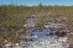 Jack pine is a species of pine with a distribution that spans almost across North America.[26] Its cones open only after trees have been cleared away by forest fires or, after logging, in the summer sun. The ice age climate was somewhat drier overall and almost all of its present-day range was covered by solid ice as late as 10,000 to 15,000 years ago.[29] Pollen analysis shows that the jack pine was almost non-existent between the Appalachian Mountains and the Great Plains during this period, with the possible exception of tiny isolated relict populations, which presents a mystery as to where the Kirtland's warbler survived during this period. Mayfield suggests that the species was restricted during this age to the southeastern Atlantic coast, which might explain its modern overwintering range in the Bahamas as opposed to Mexico, as well as why it appears to be closer related to Caribbean warbler species. The jack pine and the warbler likely colonized the Midwest around 10,000 years ago.[26]