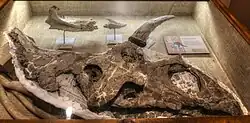 A parietal, squamosal fragments, fused jugal\epijugal and other unidentified cranial fragments.[25] A chasmosaurine ceratopsid that has been hypothesized to form an anagenetic series with several other chasmosaur species, including Terminocavus.[25]