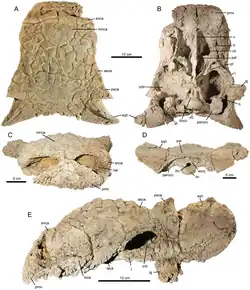 Nodocephalosaurus[17] N. kirtlandensis[17] A partial skull.[17] An ankylosaurine ankylosaurid that has cranial ornamentation similar to Akainacephalus, an ankylosaur from the Kaiparowits Formation.[17][18]
