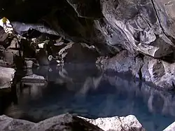The scenes with Daenerys were filmed in Morocco, and the ones with Jon in Iceland. The Wildlings camp was built by the shores of lake Mývatn, with its distinctive vertical lava formations clearly seen. The nearby grotto where Jon and Ygritte have sex is cave Grjótagjá; however, the cave was used mainly for establishing shot of Jon Snow and Ygritte in the cave, and most of this scene was filmed in the studio.[6] The thermal water pool of the cave is actually used for bathing and is a popular tourist attraction.[7]