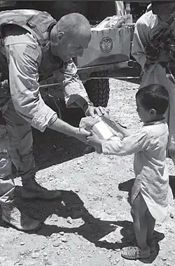![]() Captain Kit Parker hands out a hygiene pack to a boy in Kandahar Province, Afghanistan (2007 or earlier) | |