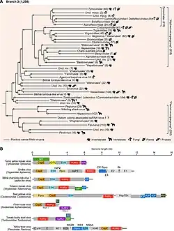 Kitrinoviricota is a phylum of RNA viruses that includes all positive-strand RNA viruses that infect eukaryotes and are not members of the phylum Pisuviricota or Lenarviricota.[1] The name of the group derives from Greek κίτρινος (kítrinos), which means yellow (a reference to yellow fever virus), and -viricota, which is the suffix for a virus phylum.[2]
