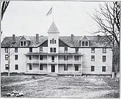 All three buildings from Duke University, including the library, were destroyed by a fire in 1972.[3][6] Six students were expelled for their alleged connection with the arson.[4] There was also a fire in the business office in March 1973.[7] In the 1970s the school also faced an investigation into the misallocation of federal money and failed to fund-raise enough money to erase debts. The last class graduated in 1975 and the school was disbanded shortly after. In 1979, the campus was purchased for a Federal Jobs Corps Center, which has remained in place since.[4] Enrollment at closure was approximately 400.