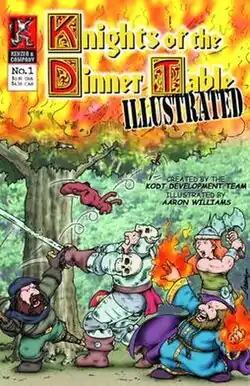 The first monthly issue was published in June 2000. Knights of the Dinner Table Illustrated (as well as HackMasters of Everknight and its sequel Everknights) was a comic set in the fictional world of the Knights of the Dinner Table in-game characters, and it ran for 41 issues.[1]: 244