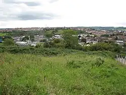 Inns Court and Filwood farms have medieval origins.[4] The surviving parts of Inns Court, originally Inyn's Court, are now part of the former Holy Cross Inns Court Vicarage and the staircase turret is now a Grade II* listed building.[10] The building is in the process of repair and is on the "at risk" register.[11] An isolation hospital was built at Nover's Hill in 1892, eventually superseded by a new hospital at Ham Green, near Pill, which opened in 1927.[4][12] The site is now occupied by the Knowle DGE (DGE standing for Discovery, Guidance and Enjoyment) Special School.[13][14] In the 1920s, the area was still rural in nature, mostly agricultural and allotment land, including Filwood Farm, Inns Court Farm and Hengrove House. The old field boundaries influenced the subsequent development.[4]