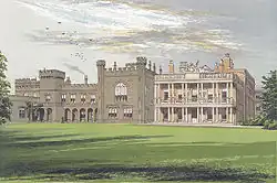 Originally Knowsley was a medieval hunting lodge in the estate of Lathom House. It was inherited by the 10th Earl in 1702 who developed the lodge into a large house. A dairy (since demolished) was designed by Robert Adam, 1776–77.[5] The house was given Gothic castellations and extended further in about 1820[6] to designs by John Foster, William Burn (who provided a boathouse and bridges in the park)[7] and other architects. In the early 20th century it was "tidied up" by W. H. Romaine-Walker for the 17th Earl. After the Second World War, the buildings were considerably reduced by Claud Phillimore, and ceased to be lived in by the family.[8] A smaller – but still substantial – family residence was built in the park.[9]