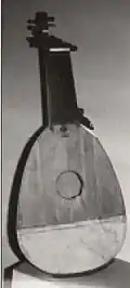 The Ukrainian kobza was a traditionally gut-strung, lute-like stringed musical instrument with a body hewn from a single block of wood. Instruments with a staved assembly also exist.[3] The kobza has a medium-length neck which may or may not have tied-on frets, which were usually made of gut. It was single-strung (sometimes also double-strung) and the strings were played with fingertips or occasionally with a plectrum threaded through a ring placed on the middle finger.