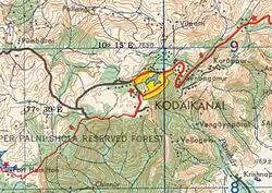 In 1867, Major J. M. Partridge imported Australian eucalyptus and wattle trees and in 1872, Lt. Coaker cut a path along the steep south east facing ridge which overlooks the plains below and prepared a descriptive map the region.[12][13] In the later half of the 19th century, it became a regular summer retreat for American missionaries and other European diplomats as a refuge from the high temperatures and tropical diseases of the plains.[14][15] In 1901, the first observations commenced at the Kodaikanal Observatory.[16] In 1909, the area had developed into a small town with 151 houses and a functioning post office, churches, clubs, schools and shops.[14] In 1914, the ghat road was completed.[11] It continued to serve as a summer retreat during the British Raj and became a popular hill station later.[1]
