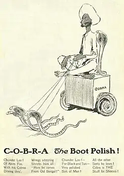In 1908 the British firm of Blyth & Platt Ltd., manufacturers of Cobra Boot Polish, opened a factory in Sydney. In 1909 full-page advertisements for Cobra Boot Polish began to be published weekly in The Bulletin, each one including verse written by O'Ferrall.[16] The evolving series of advertisements featured a character from the Indian sub-continent named "Chunder Loo, of Akim Foo", his bevy of cobras and his two companions, an anthropomorphic koala and a fox-terrier.[1][17][16] The drawings of some early versions of the Cobra Boot Polish advertisements include the initials "N.L.", indicating that Norman Lindsay was the artist at that stage.[18] During the pre-war years of the White Australia policy, the depiction of racial stereotypes was a routine comedic device for artists and writers.[16] The advertisements proved to be so popular that in 1915 the proprietors of Cobra Boot Polish published a book entitled The Adventures of Chunder Loo, featuring O'Ferrall's verse and drawings by Lionel Lindsay.[19][20] During World War I the Cobra advertisements dealt with patriotic themes.[21] The advertisements continued to be published in The Bulletin until 1920.[22][C]