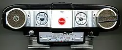 Focusing on the Kodak stereo camera is done by turning a dial located on the lens mount. The two dials are ganged so that they focus together and they can be focused by turning either dial.[1] The right lens focus dial is marked with distances 4, 5, 6, 8, 10, 15, 25, 50, INF.[1] Behind this dial is an arrow pointing at the point of focus and red marks showing the range of sharp focus for 3.5, 5.6, (red dot) and 8.[1] The red dot corresponds to f 6.3. This is very similar to the depth of field scale on later model Realists. The left lens focus dial is marked "close ups", "groups" and "scenes".