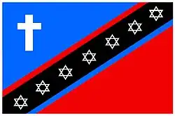 The official flag of the church is divided diagonally from the lower hoist corner to upper fly corner by a broad black band bearing seven white David's stars; the black band is edged in red stripe at the upper portion, blue stripe at the lower portion; the upper hoist-side triangle is sky-blue with a white cross imposed on it; the lower triangle is red.