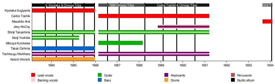 Carlos Toshiki & Omega Tribe (カルロス・トシキ&オメガトライブ) was the second band in the project that was active from 1986 to 1991. Originally formed as 1986 Omega Tribe (1986オメガトライブ), the band consisted of lead vocalist Carlos Toshiki and guitarist Teruka Kurokawa as well as Takashima and Nishihara, who both returned to the project. After Kurokawa left the band in 1988, the band changed its name and later welcomed vocalist Joey McCoy as a fourth member that same year.[5]