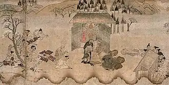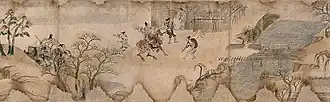 The paintings also observe a regular composition in three planes: a natural foreground (rocks, trees) serving to create depth in the scene; the figures and landscape elements (buildings, roads, fields, etc.) of the story occupying the entire center; and finally a distant and stylized landscape at the top of scroll.[6] This composition is inspired by the canons of Chinese art of the Tang dynasty with typically Japanese variations. The unrealistic perspective is classically based on parallel lines and the point of view is always the same, slightly elevated at the front.[10][11] On the other hand, the lines and outlines in ink are finer and less free than in the other otoko-e works.[12] Here, the lines are characterized by their simplicity; landscape elements are stylised and used mainly to mark transitions between scenes.[13] The narration is based on the repetition of scenes, fundamentally almost unchanged like the representation of the temple or the hunter's hut, in order to illustrate a succession of consecutive events.[6][14]