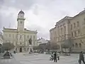 - Klapka Square – Today's square was created at a place of a small lake, which was formerly protecting by the walls of the medieval city. A marketplace was created there later. On the north side of it, at the end of the 17th century, there was a town hall for council meetings. In 1725 it was rebuilt. After major damage caused by the earthquake in 1763, it was restored in 1766 and supplemented in the following year by a fire guard tower. After a fire in 1848, the building was renovated again, but it was necessary to enlarge it, so in 1875 it was updated by a new watchtower, creating a town hall in the way we know it today. In the window of its tower, from the New Year's Eve 1999 between 10 am – 4 pm every two hours, a figure of a hussar from 1848/49 appears in two-hour intervals and plays a song written for the hero Klapka.