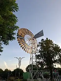 In October 2021, the city government announced a plan to restore the windpump, citing its historical significance.[7][8] The construction of the new windpump cost around 198 million rupiahs and was expected to finish in 2022.[9][10] However, the construction took less time than expected, finishing on 16 December 2021.[10] The windpump was inaugurated by the mayor of the city, Aditya Mufti Arifin, on 24 December 2021.[11] The restored windpump features a surrounding urban garden as well as LED lighting illuminating the structure.[12][13][14] It is intended as a monument only, and does not function as a water pump anymore.[2]