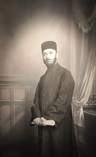 Orphaned at a young age, Komitas was taken to Etchmiadzin, Armenia's religious center, where he received education at the Gevorgian Seminary. Following his ordination as vardapet (celibate priest) in 1895, he studied music at the Frederick William University in Berlin. He thereafter "used his Western training to build a national tradition".[10] He collected and transcribed over 3,000 pieces of Armenian folk music, more than half of which were subsequently lost and only around 1,200 are now extant. Besides Armenian folk songs, he also showed interest in other cultures and in 1903 published the first-ever collection of Kurdish folk songs titled Kurdish melodies. His choir presented Armenian music in many European cities, earning the praise of Claude Debussy, among others. Komitas settled in Constantinople in 1910 to escape mistreatment by ultra-conservative clergymen at Etchmiadzin and to introduce Armenian folk music to wider audiences. He was widely embraced by Armenian communities, while Arshag Chobanian called him the "savior of Armenian music".[11]