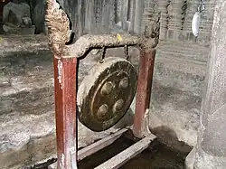 Gong below the main sanctum sanctorum of the Angkor Wat, possibly a Kong thom (a single hanging gong).Example of a hanging gong from Angkor Wat, north gallery, 16th century. The gong hanging on the two men's shoulders is a nipple gong, a type used in the highlands today.