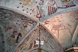The church contains a few fragments of Romanesque murals.[2] It also has a set of purely decorative murals from the 15th century, and notably rich murals from the early 16th century.[3] The latter contain depictions of the Annunciation, the Annunciation to the shepherds, the birth and circumcision of Jesus, as well as the Adoration of the Magi, the Massacre of the Innocents, and an extra-biblical legend about the Flight into Egypt.[3]