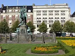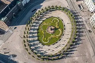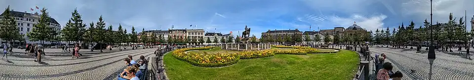 Kongens Nytorv (lit. "The King's New Square") is a public square in Copenhagen, Denmark, centrally located at the end of the pedestrian street Strøget. The largest square of the city, it was laid out by Christian V in 1670 in connection with a major extension of the fortified city, and has an equestrian statue of him at its centre. The initiative moved the centre of the city from the medieval area around Gammeltorv, at that time a muddy medieval marketplace, to a cobbled new square with a garden complex, inspired by the Royal city planning seen in Paris from the early 17th century.[1]