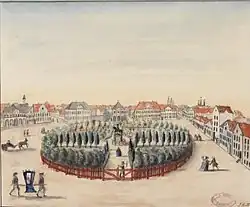Shortly after Christian V was crowned in 1670, he decided to level and cobble the square. This decision was taken mainly for military reasons, its strategic location with almost the same distance to all points along the ramparts of the city making it well suited as a central alarm square. At the same time, the square was to serve as a place royale with inspiration from France.[2]